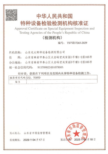 山東光大特種設備檢測有限公司是經山東省市場監督管理局核準的甲類B1特種設備綜合檢驗機構。2017年9月30日取得了山東省市場監督管理局頒發的《檢驗檢測機構資質認定證書》。2018年2月22日取得了山東省市場監督管理局頒發的《特種設備檢驗檢測機構核準證》(起重機械)檢驗檢測資質。2021年11月取得山東省市場監督管理局版發的《特種設備檢驗檢測機構核準證》(安全閥在線、離線)校驗資質。2023年11月取得山東省市場監督管理局頒發的甲類檢驗機構B1《特種設備檢驗檢測機構核準證》,具有壓力容器(RD2...